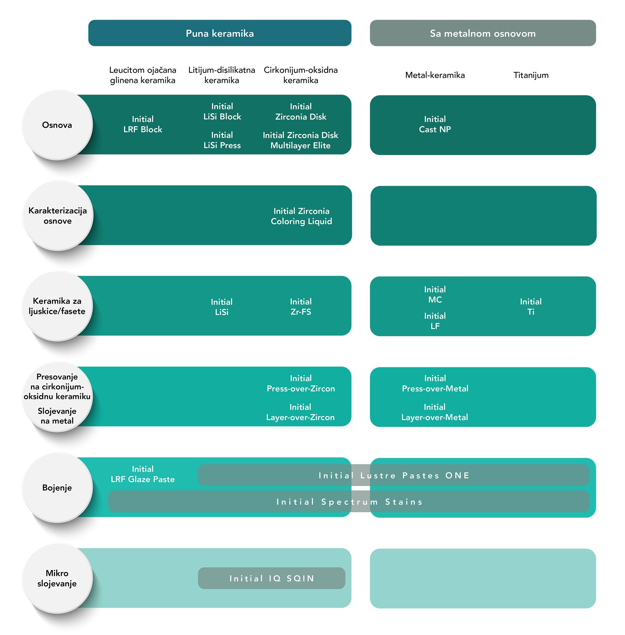 Rešenja za bojenje se sastoje od dve linije proizvoda – Initial Lustre Pastes i Initial Spectrum Stains – i pogodni su za širok raspon koeficijenata toplotnog rastezanja, pružajući restauracijama boju i sjaj.